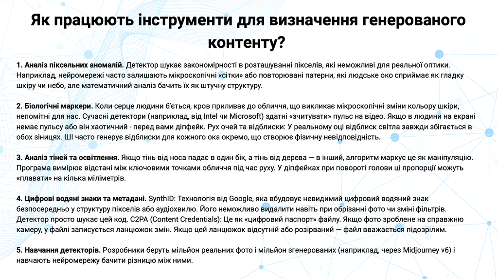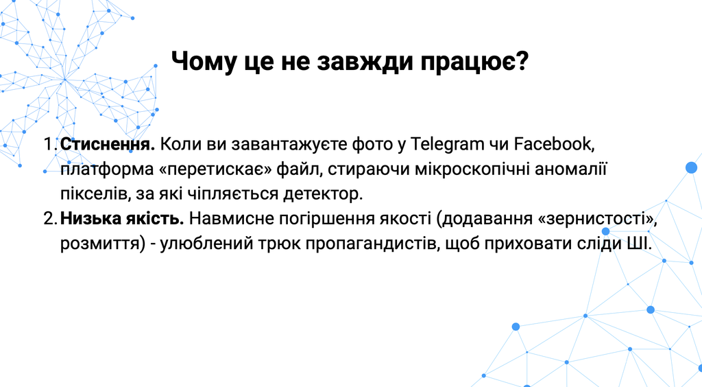 — Жоден інструмент не дає 100% гарантії. Це допоміжний засіб, але не остаточне рішення, — зазначає вона. — Причин кілька: файли стискаються в соцмережах, якість може бути навмисно погіршена, а самі технології постійно вдосконалюються.