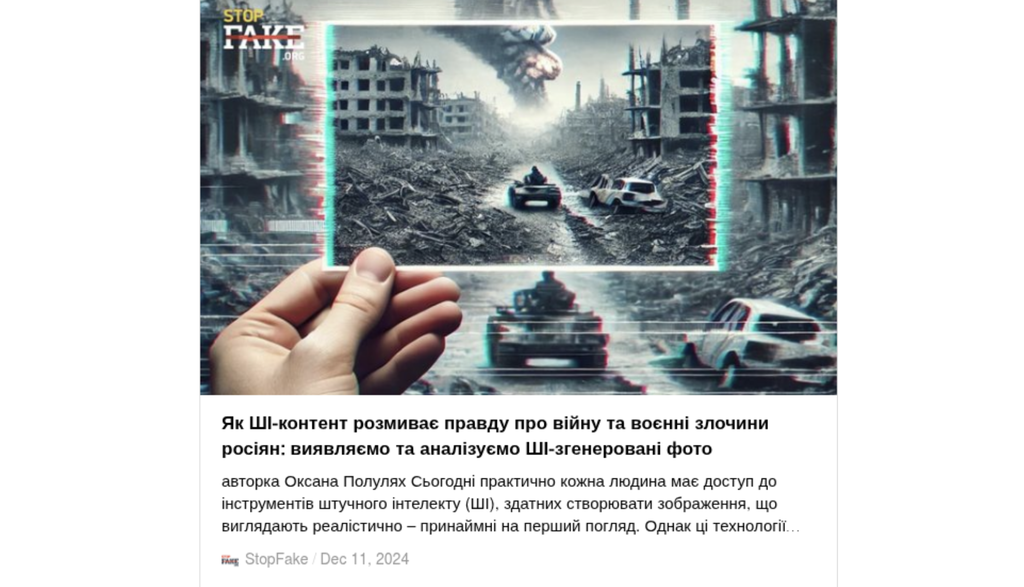 Окрему небезпеку становить те, що штучний інтелект активно використовується у дезінформаційних кампаніях. Наприклад, в українському контексті вже видно, як ці технології застосовуються для створення фейкових відео, підроблених аудіо та зображень, які поширюються через соціальні мережі. Такий контент часто експлуатує чутливі теми — наприклад, мобілізацію або війну. Такі наративи швидко масштабуються, створюючи ілюзію масовості та «доказовості». А головне — тепер навіть реальні відео або аудіо можуть бути поставлені під сумнів: достатньо заявити, що це фейк.