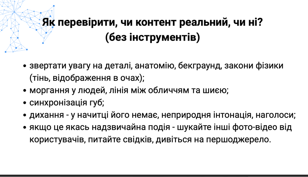 — Звертайте увагу на дрібниці: анатомію, тіні, відображення. Дуже часто саме деталі «видають» штучний контент, — пояснює вона. — У відео варто дивитися на синхронізацію губ і звуку, а також на загальну природність поведінки. В аудіо — на дихання, інтонацію, наголоси.