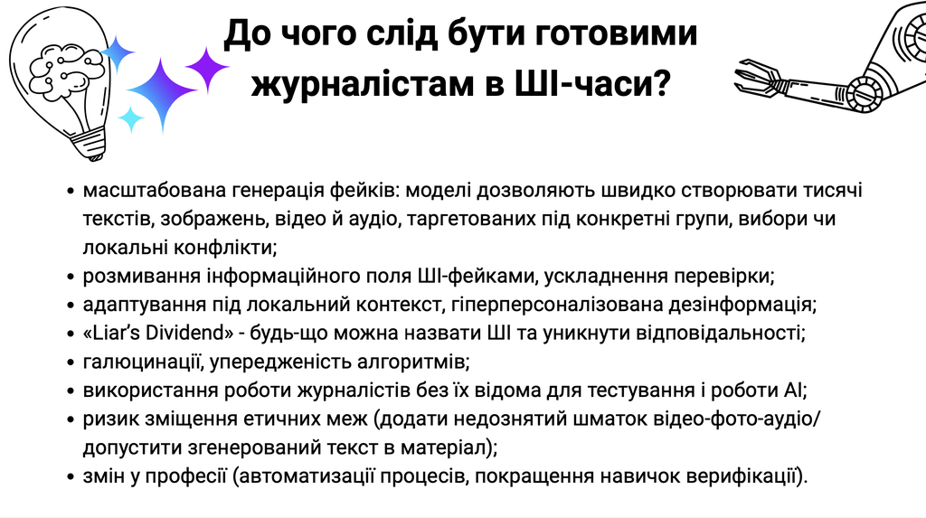 Не менш важливо розуміти і природу самого штучного інтелекту. Він не «знає» правди і не прагне її знайти. Це алгоритм, який працює зі статистикою та даними, на яких був навчений, і генерує найбільш імовірну відповідь. Тому його результати можуть містити помилки, упередження або навіть вигадані факти — «галюцинації».