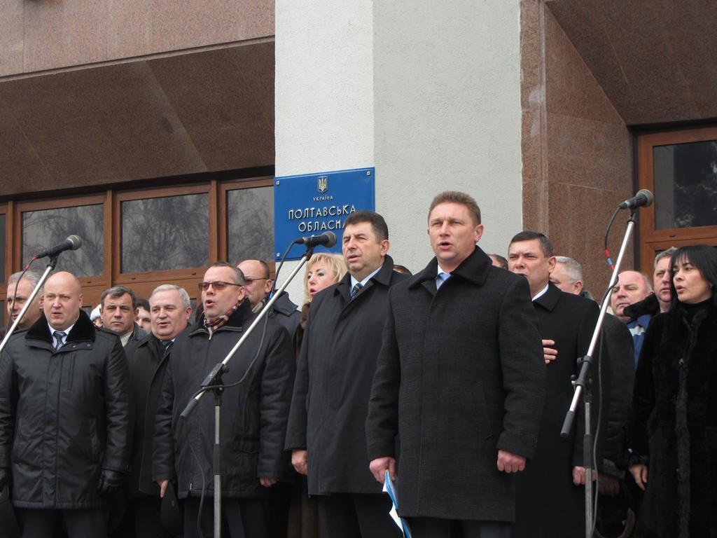 «Вже перейдено межу терпіння і конструктивного діалогу, найважче сьогодні президенту України Віктору Януковичу, він гарант дотримання конституції. Ми схвалюємо дії президента, його готовність до діалогу і компромісів. А саме головне у нас — підтримка людей. У 2010 році Президент України був законно обраний і це визнав весь світ, наш парламент також законно обраний. Ніхто, ніде, ні за яких умов не висловив нам недовіри, а навпаки, ми гідно представляємо свій народ і свої громади. Опозиціонери захопили наше спільне приміщення, але й тут вони скористалися чужими завезеними штурмовиками, які стояли на цій площі в касках з битками, і були готові кинутися на мирних громадян. Вони хочуть переконати, що діють від імені полтавських громадян, але ми їм не віримо, тому що громада полтавська стоїть саме тут сьогодні».