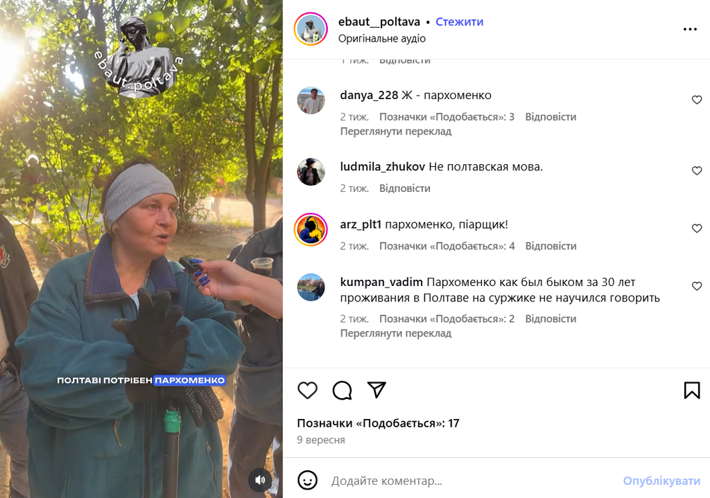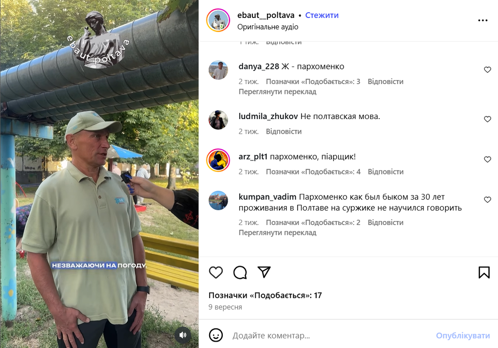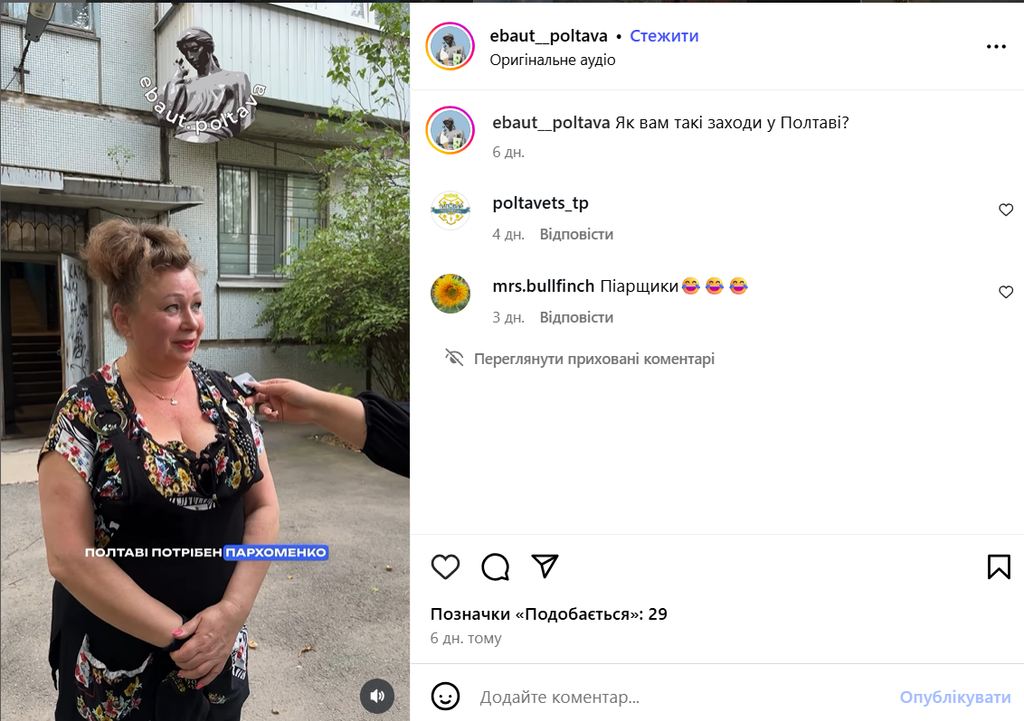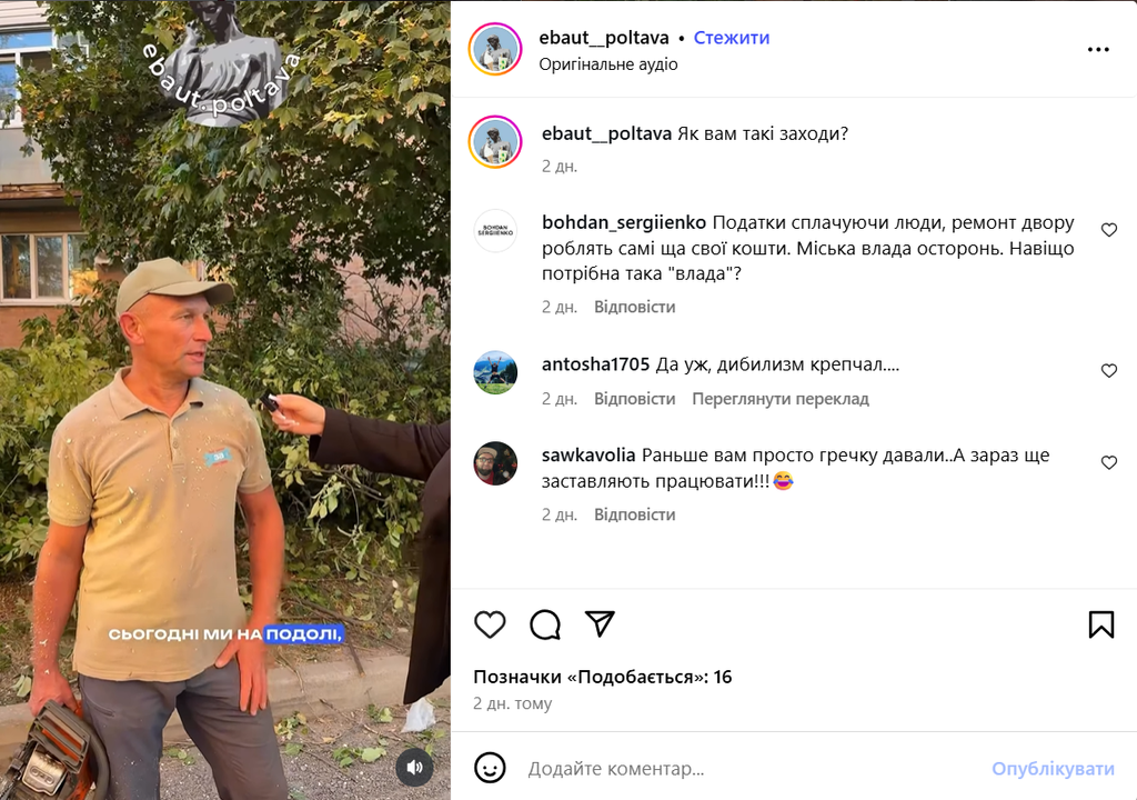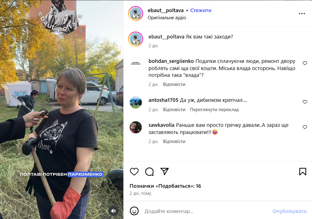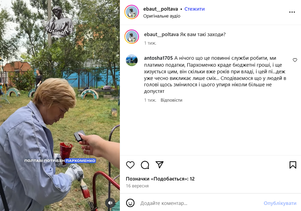 Окремо слід відзначити піар посадовця в Інстаграмі. Ми відмітили канал ebaut__poltava, де безліч відео присвячені толокам і Пархоменку. З цікавого, у кожному відео з дворів обов'язково хтось має сказати ключову фразу «Полтаві потрібен Пархоменко».