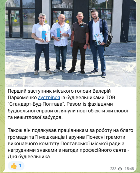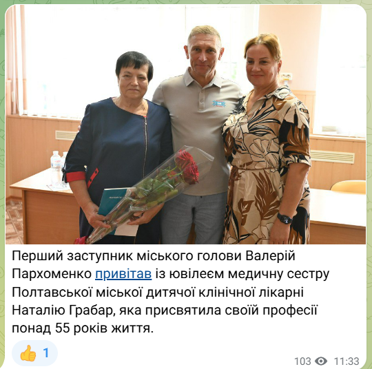 Так само посадовець не втрачає можливості пропіаритися у робочий час у власному мерчі. На сайті Полтавської міськради та в офіційному телеграм-каналі є безліч новин, в яких фігурує посадовець при виконанні посадових обов’язків і при цьому він одягнений у свій мерч.