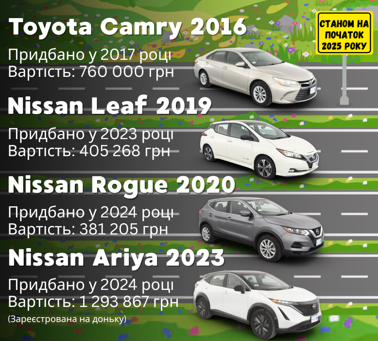 Крім того, у 2024 році він придбав авто NISSAN ROGUE (яке вказав у декларації) за 381 205 грн, також у родини з'явилося авто Nissan Ariya, яке він не декларує, але користується ним і коштує воно орієнтовно 30 тисяч доларів. Якщо підсумувати ці витрати ми отримаємо приблизно 51 тис доларів, або 2 млн 142 тисячі гривень.