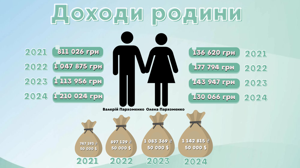 Можна вирахувати, що Пархоменко з дружиною мали б витратити за 2024 рік лише на ці покупки всю заробітну плату, гривневі заощадження і навіть почали витрачати долари. Це при тому, що ми не враховуємо кошти, які мали бути витрачені на базові потреби: харчування, оплату комунальних послуг, транспортні витрати тощо.
