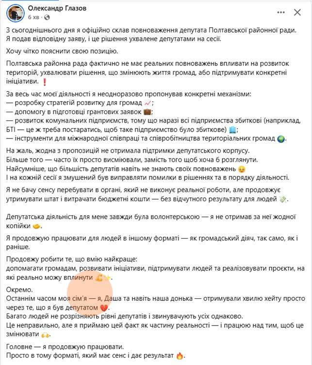 — З сьогоднішнього дня я офіційно склав повноваження депутата Полтавської районної ради, — повідомив на своїй сторінці у Фейсбуці Олександр Глазов: