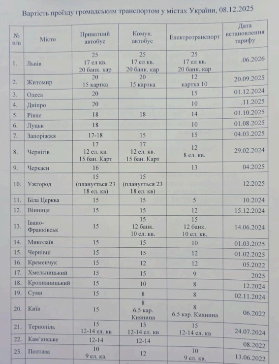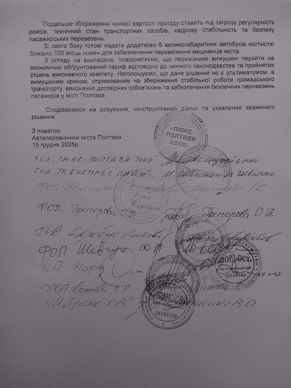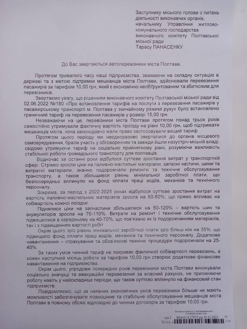 На початку тижня перевізники офіційно звернулися до Полтавської міської ради з листом, у якому повідомили про неможливість подальшої роботи за нинішньою вартістю проїзду. За словами підприємців, діючий тариф більше не покриває витрат на утримання транспорту та забезпечення безпечних і стабільних перевезень.