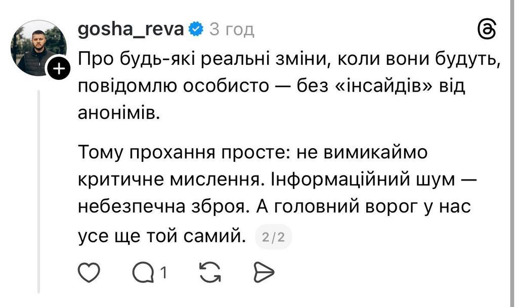 – За кілька днів анонімні телеграм-канали вже встигли «призначити» мене начальником Полтавської ОВА. Дійшло до запитів від медіа, тож зафіксую реальність. Полтавщина для мене — не чужий регіон. Там ми з братом народилися, довгий час жили і там мобілізувалися у лютому 2022-го року. Я щиро переживаю за стан справ у області. Але співпереживання — це не посада. Замовникам мінусової кампанії співчуваю: ви викинули гроші на вітер. Станом на сьогодні я продовжую службу. І пишаюся цим, – пише у Threads Ігор Рева.
