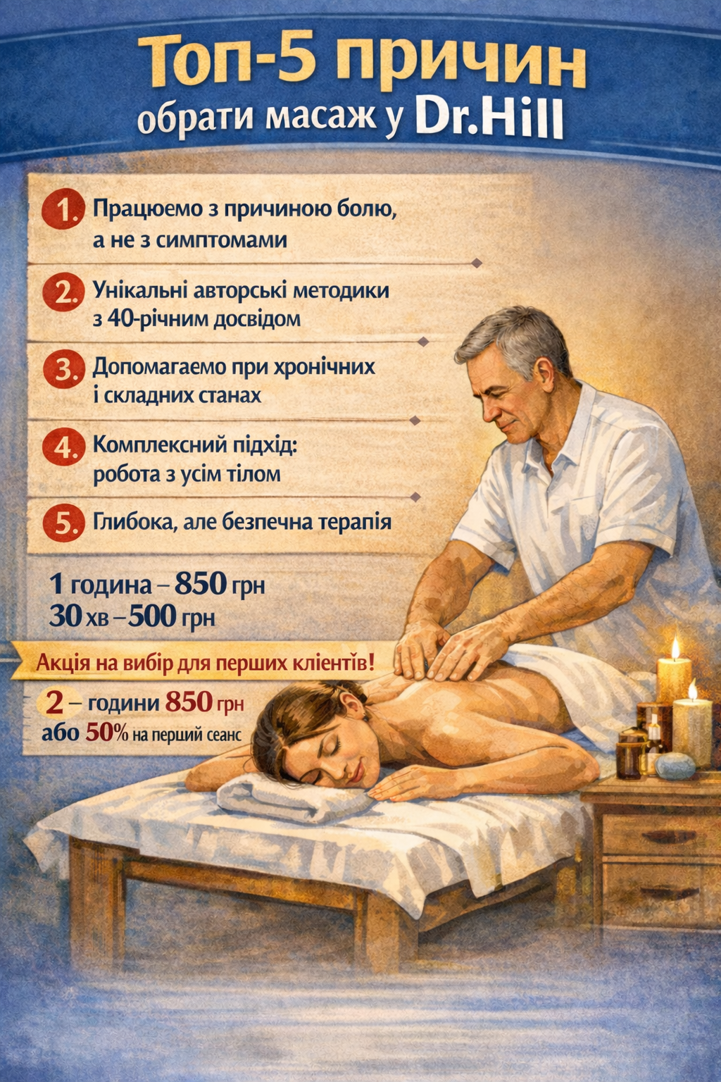 Саме тому в студії Dr.Hill ми робимо інакше: даємо можливість відчути різницю одразу, а не після місяців експериментів. Для нових клієнтів діє спеціальна пропозиція — 2 години терапевтичного масажу за ціною однієї. Це не маркетинговий трюк, а можливість повноцінно пропрацювати тіло, побачити підхід у роботі й зрозуміти, чи це саме той формат, який вам потрібен.