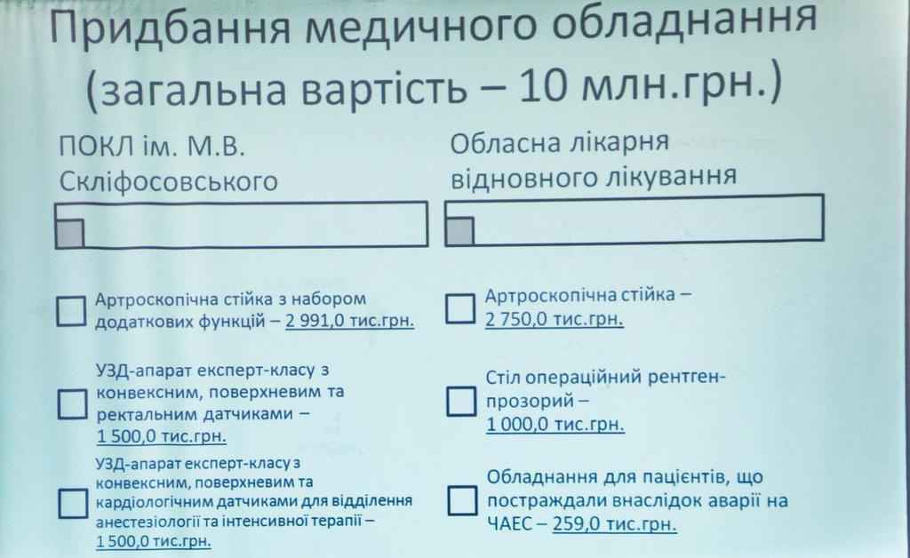 Майже 260 тисяч гривень заплановано для закупівлі обладнання для лікування хворих, що постраждали в наслідок аварії на ЧАЕС. Ще 1 млн грн — щоб придбати для лікарні відновного лікування сучасний, рентген-прозорий операційний стіл.